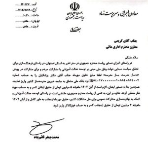 بر اساس نامهی محمدجعفر قادریپناه، معاون اجرایی و سرپرست نهاد ریاستجمهوری، این اقدام در پی سفر اخیر رئیسجمهور به استان اصفهان و تأکید ایشان بر لزوم مشارکت در امور فرهنگی و آموزشی صورت گرفته است.