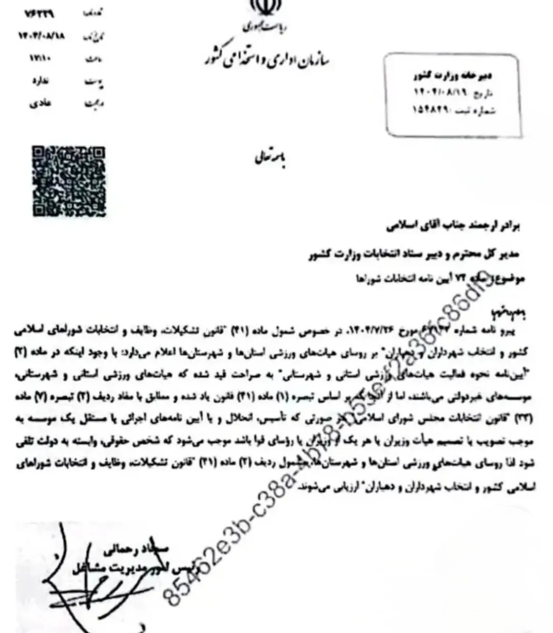 دبیرخانه وزارت کشور با صدور نامه‌ای رسمی به ستاد انتخابات وضعیت حقوقی روسای هیئت‌های ورزشی استان‌ها و شهرستان‌ها را درباره نامزدی در انتخابات شوراهای اسلامی شهر و روستا مشخص کرد.